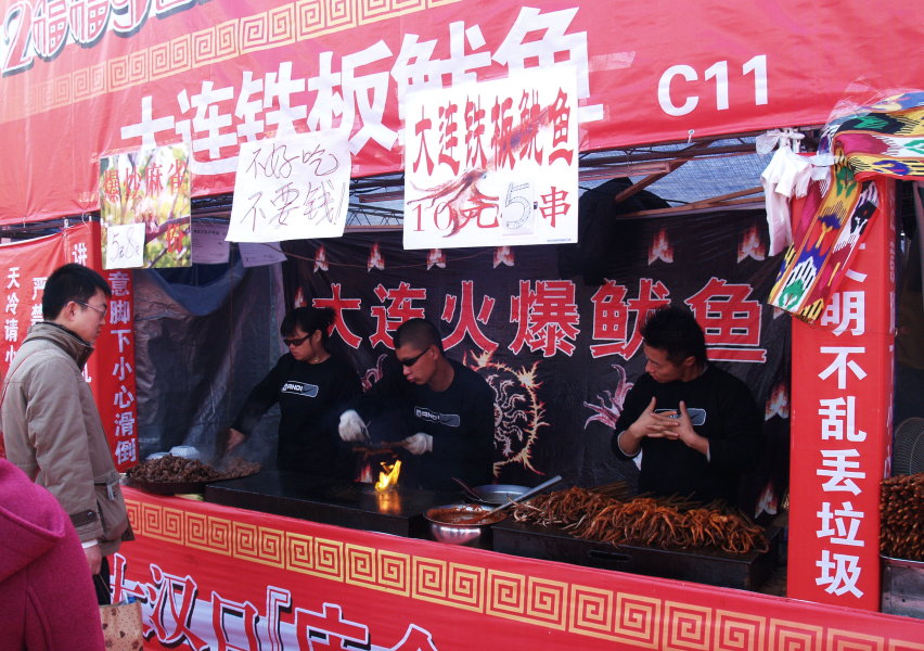 下面的主题是烧烤。中国人什么都敢吃,武汉人什么都能烤,不过搞个吸引眼球的招牌还是很有必要的。这家是新疆的。这次庙会有个特点就是大家都以跳舞来显示自己是少数民族或者外邦人士,这位戴着新疆帽的就在扭动中。另外这位食客我认为酷似刘欢在唱油和米。油米都不是问题,俺已经吃上肉了……